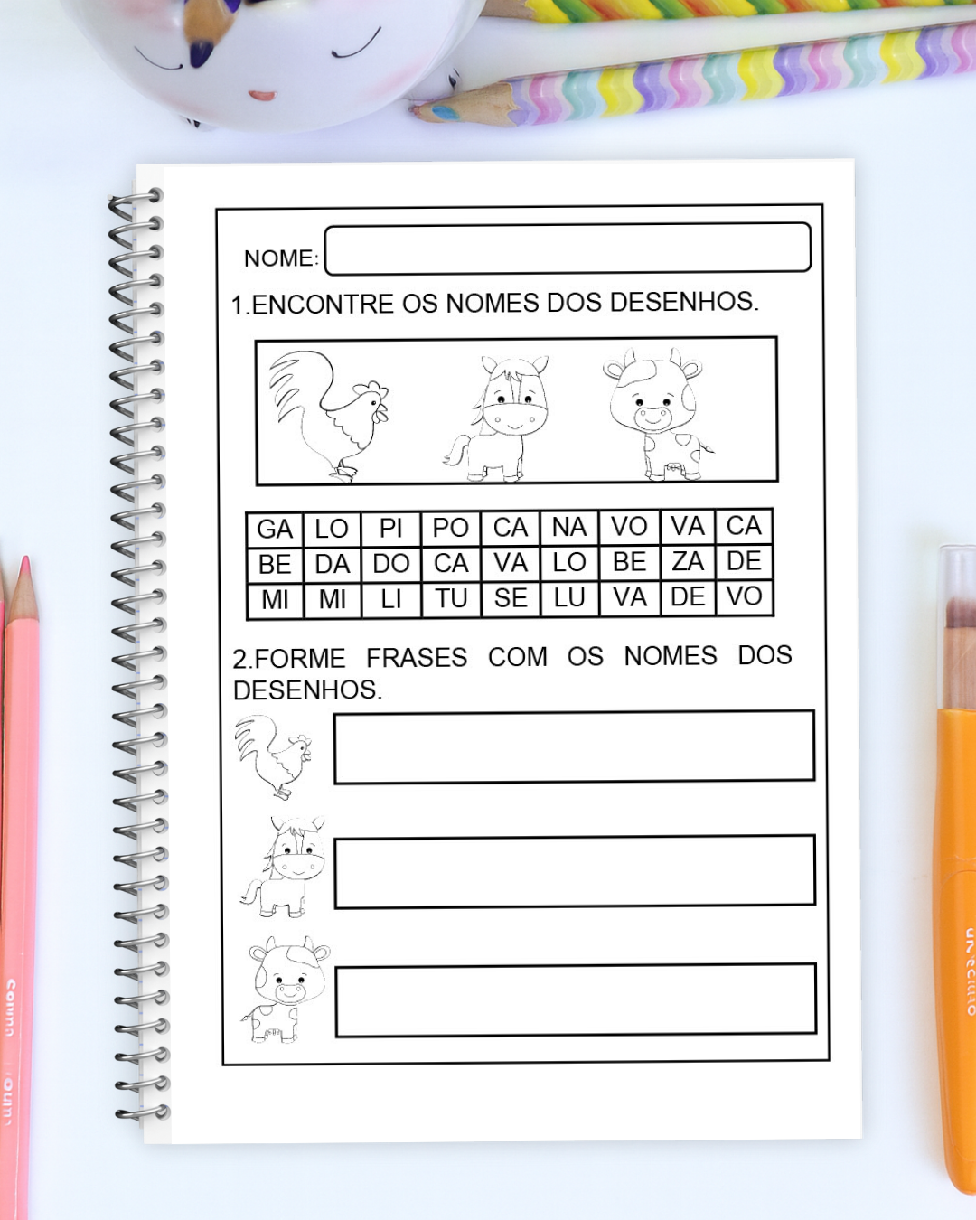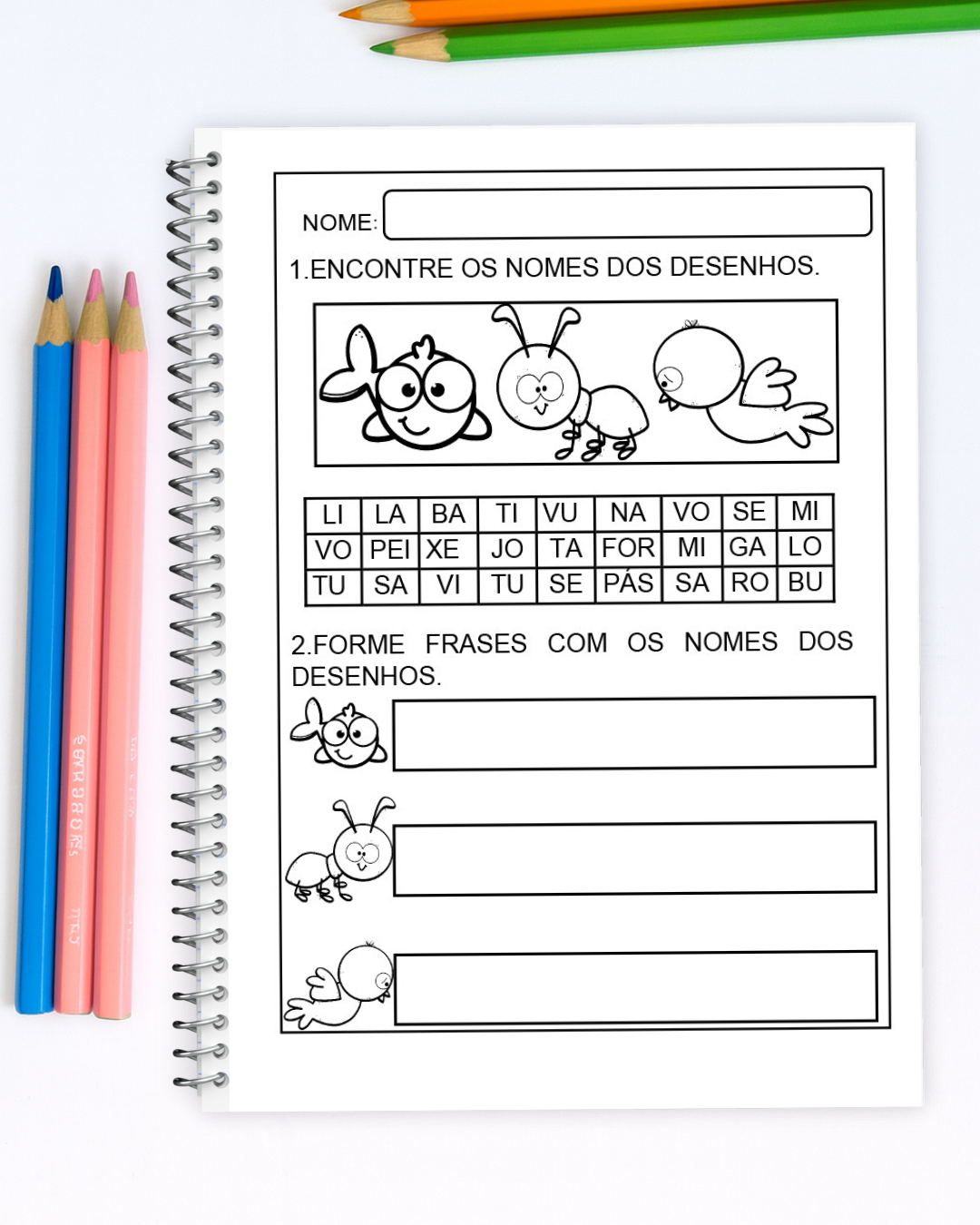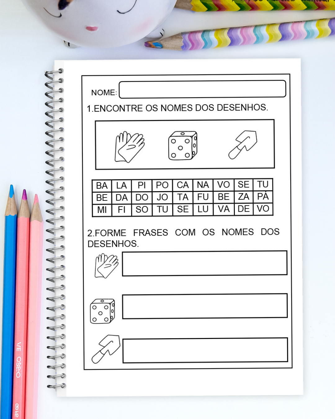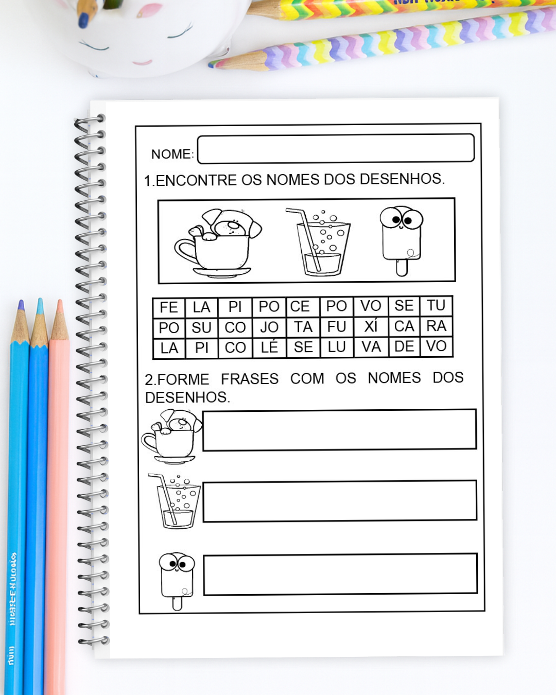 Esse material incrível traz atividades de caça-palavras onde as crianças identificam os nomes dos objetos a partir dos desenhos e formam frases.