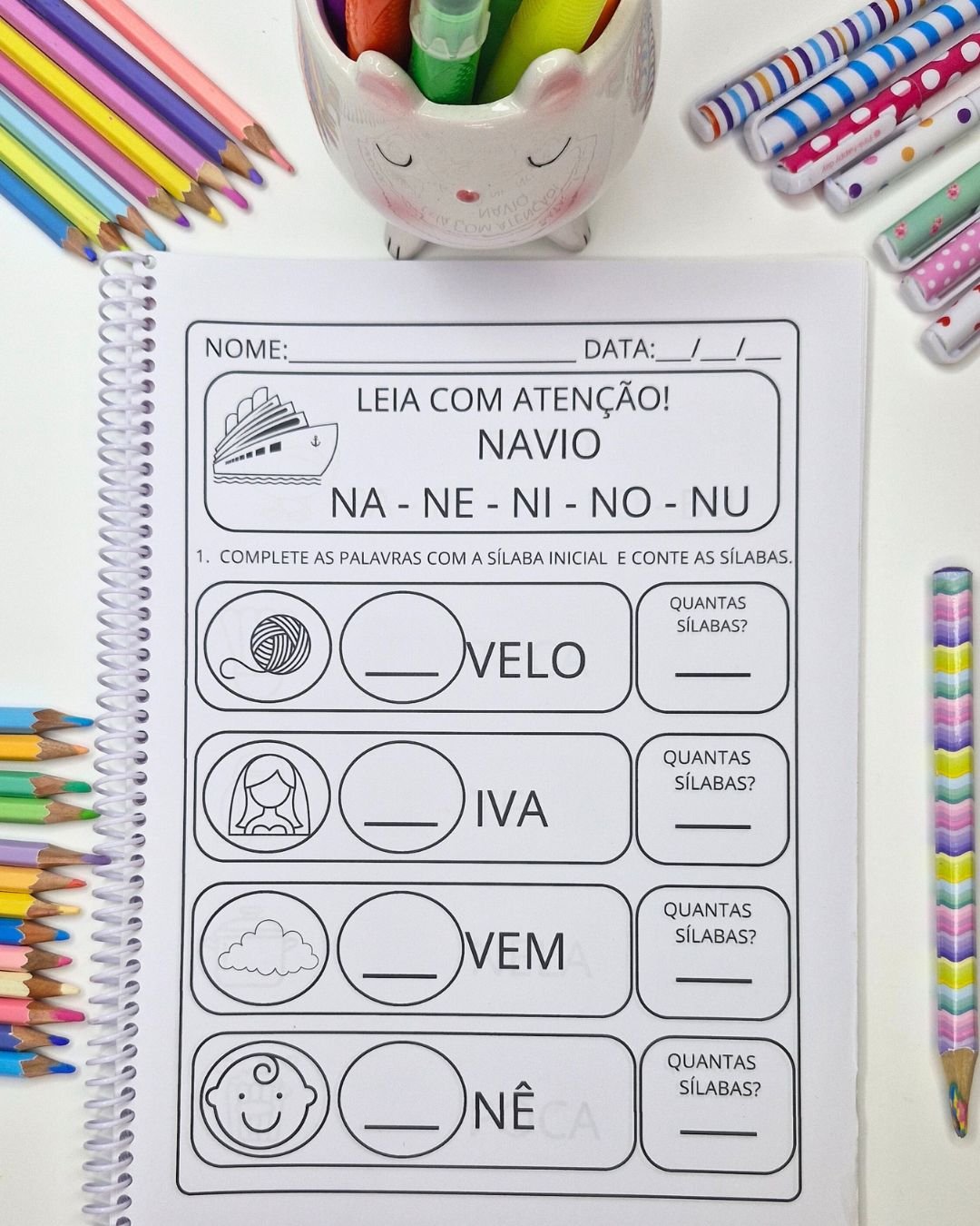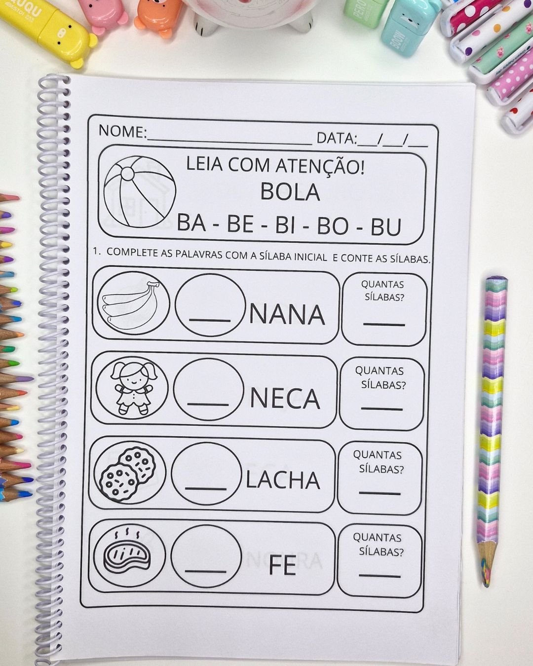 🔠 A atividade envolve completar palavras com a sílaba inicial e contar o número de sílabas, ajudando os pequenos a desenvolverem habilidades fonológicas de forma eficaz.