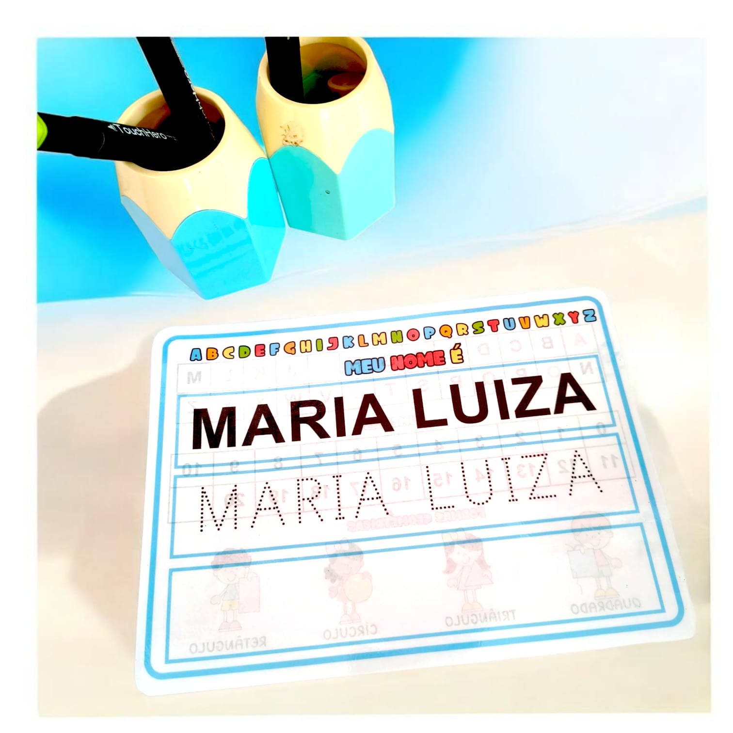 ✔ Nome da criança em *letra bastão pontilhada* para treino da coordenação motora