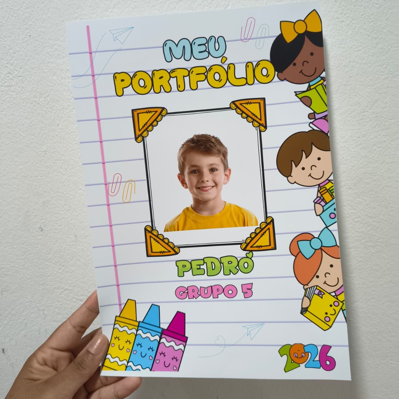 A *Capa para Portfólio Editável com Foto* é ideal para professores organizarem atividades, avaliações e registros dos alunos ao longo do ano.
