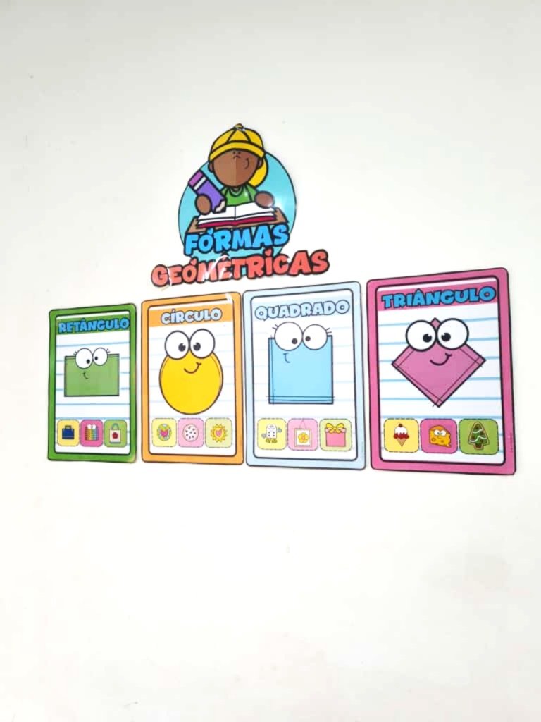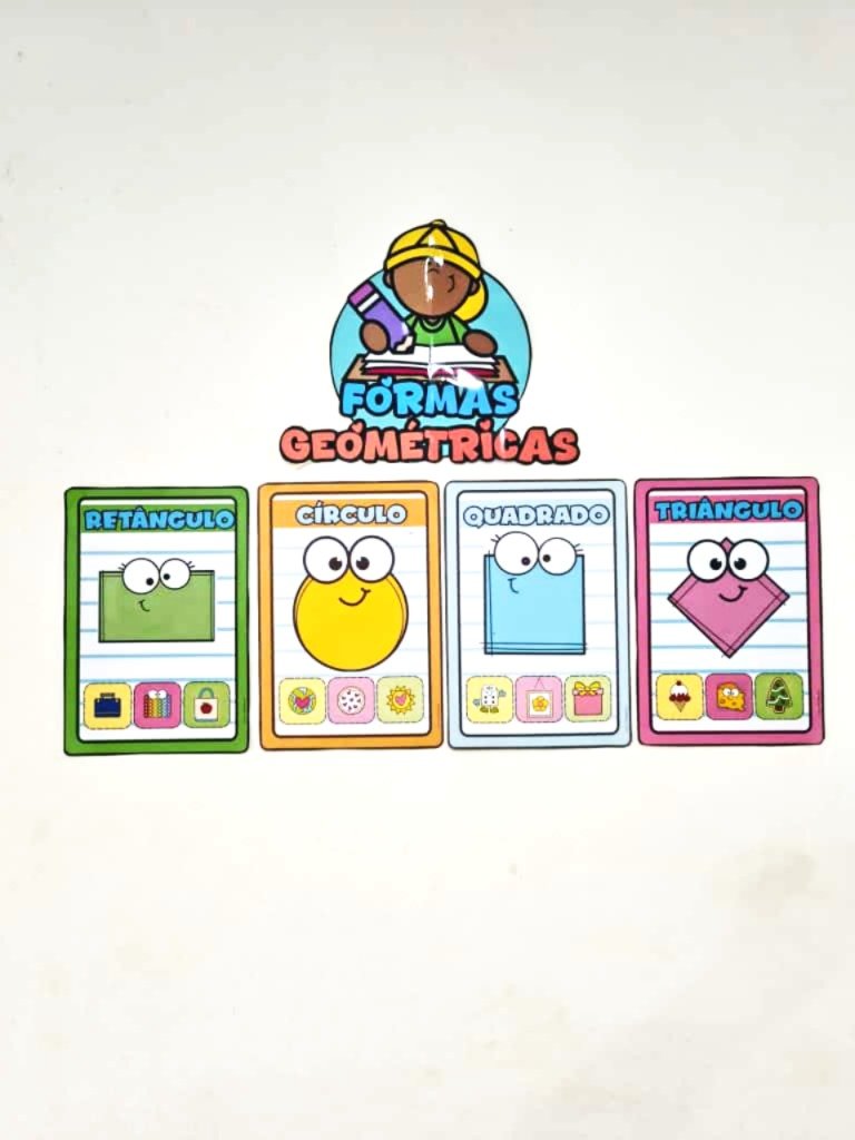 Cada forma — quadrado, círculo, retângulo e triângulo — vem acompanhada de ilustrações de objetos do cotidiano, ajudando as crianças a reconhecerem as formas no mundo real de maneira lúdica e visual! 🎨✨