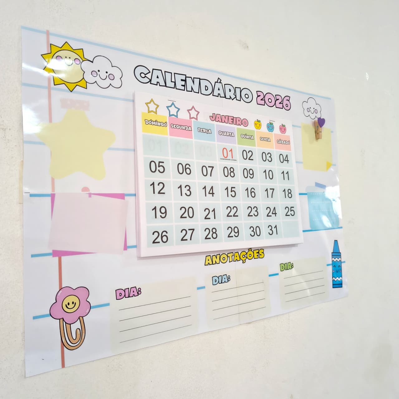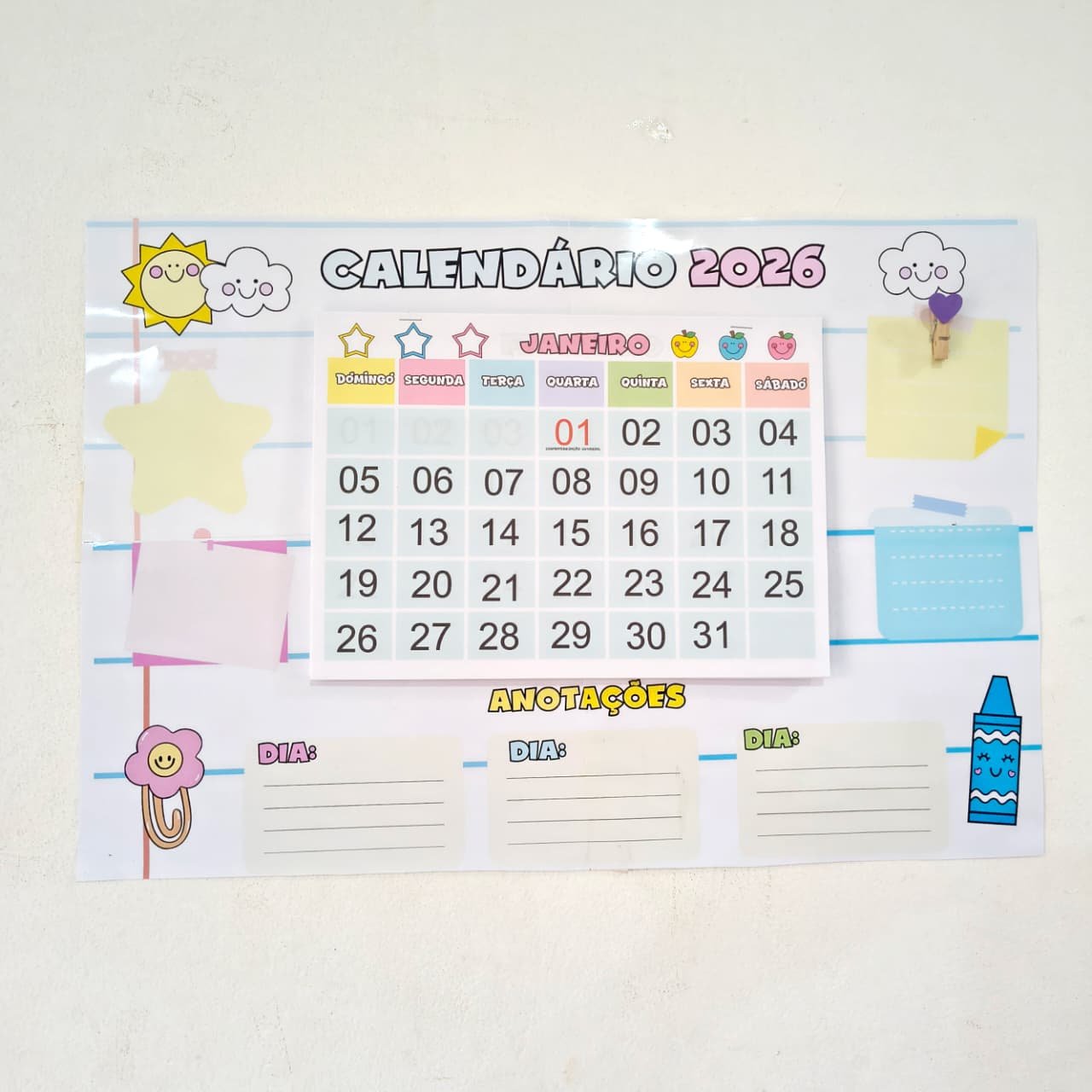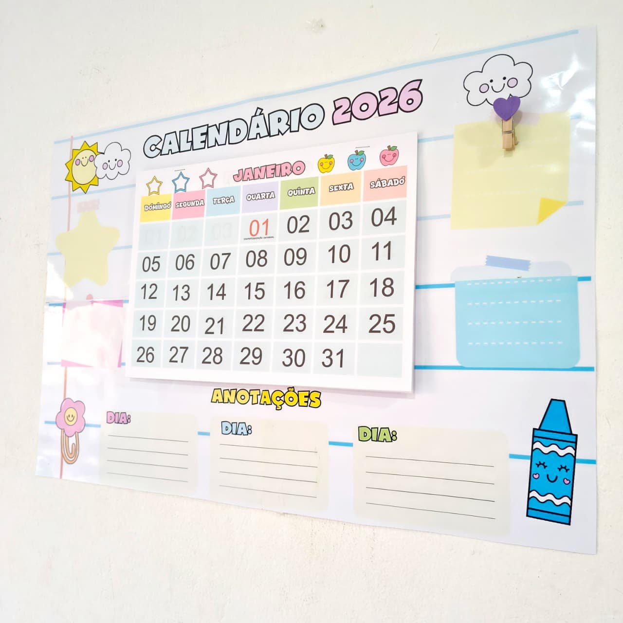 O *Calendário 2026* é um material prático e versátil, com *todos os meses do ano, ideal para organizar a rotina escolar ou pessoal. Possui **espaço para anotações*, facilitando o registro de compromissos, datas importantes e atividades do dia a dia.