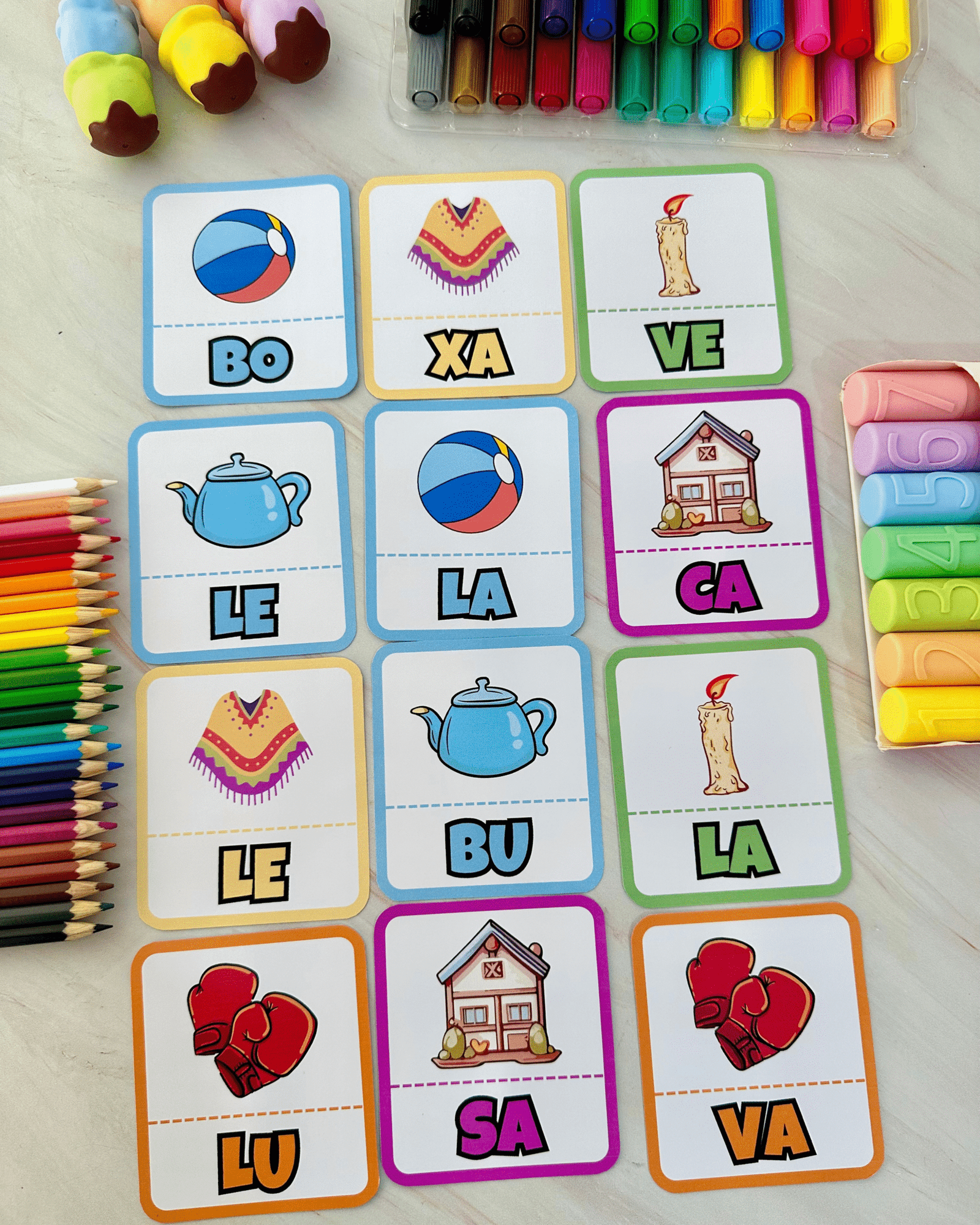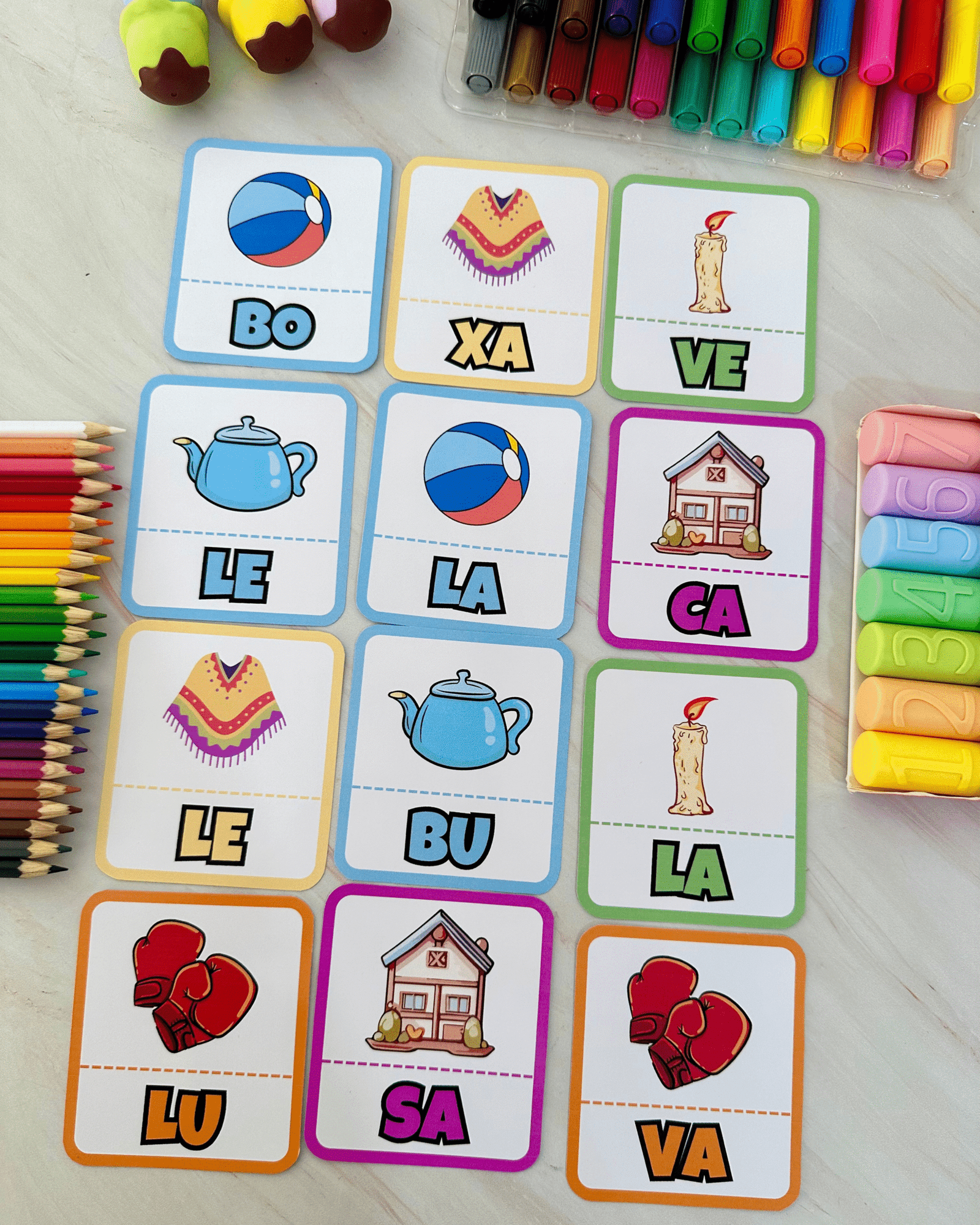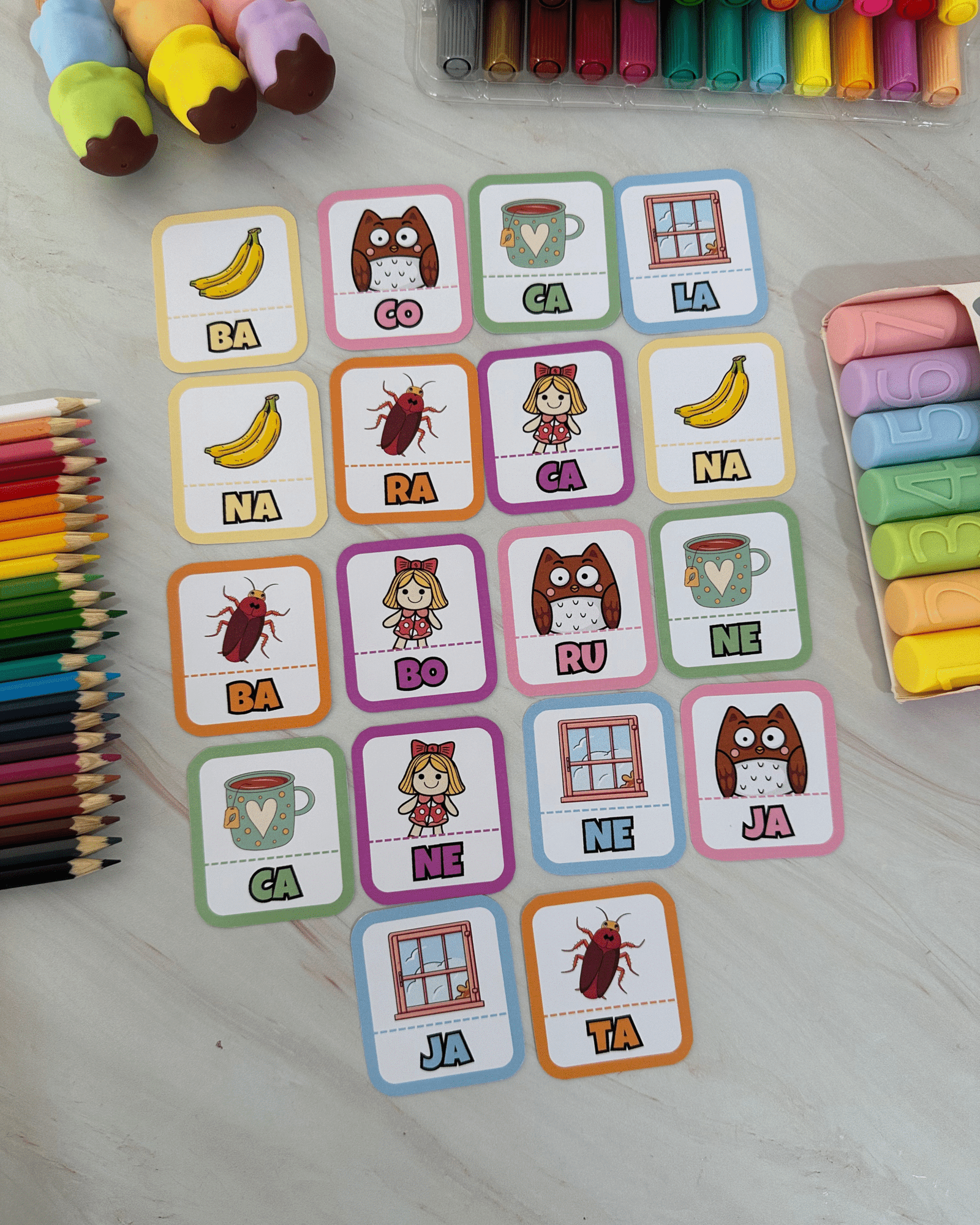 💡 Estimula a memória visual e a consciência fonológica 🎲 Desenvolve a associação de sílabas de forma lúdica e inclusiva 📘 Ideal para Educação Especial e alfabetização inicial 🖨️ PDF pronto para imprimir — recomendado papel fotográfico 180g