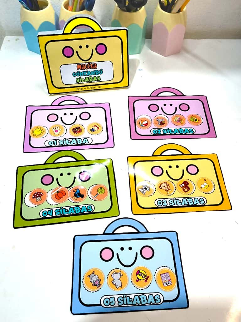 Cada maletinha traz um desafio diferente: encontre as palavras com 1, 2, 3, 4 e 5 sílabas 🗣🔤