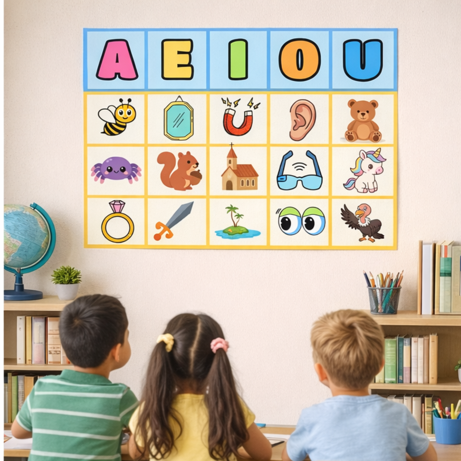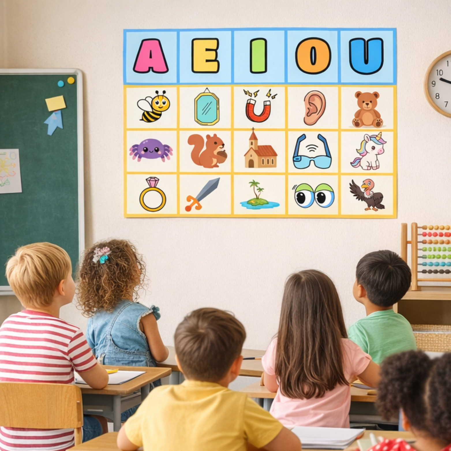 O cartaz apresenta as letras A, E, I, O, U acompanhadas de imagens ilustrativas, auxiliando no reconhecimento das letras, associação som–imagem e desenvolvimento da consciência fonológica.
